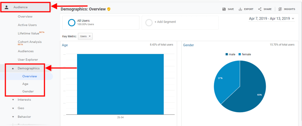 Compare data to see if your traffic is mainly made up of male or female visitors. This report can guide you to see if you’re attracting the right gender(s) to your store or how you can use it to tailor your content. You can find this report under Audience > Demographics > Gender.