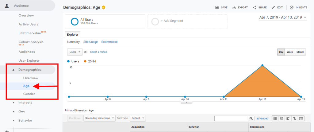 Take a glimpse at your audience age range so you can understand which age ranges are most likely to visit your site. You can find this report under Audience > Demographics > Age.