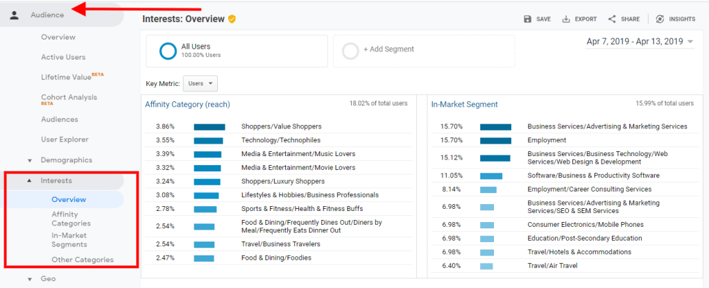 Interest Interest Reports in Google Analytics will tell you your users’ interests on other parts of the internet. This will help you identify a more specific target audience, cross or upselling opportunities, better blog content ideas.