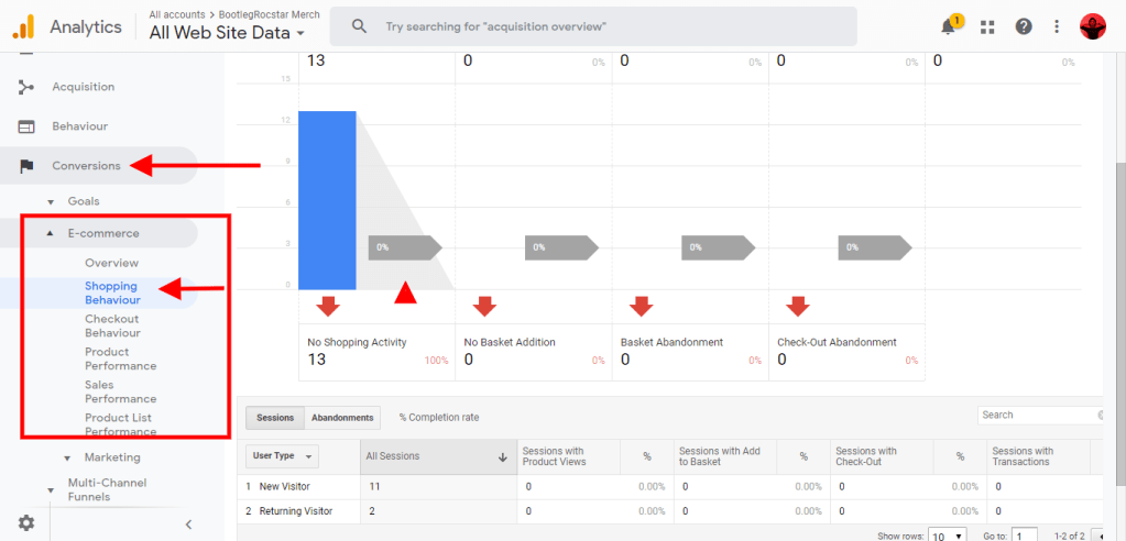 Use the “Shopping Behaviour” report and the Behaviour tab in Google Analytics to understand your buyer’s journey for both new and returning customers on your site.