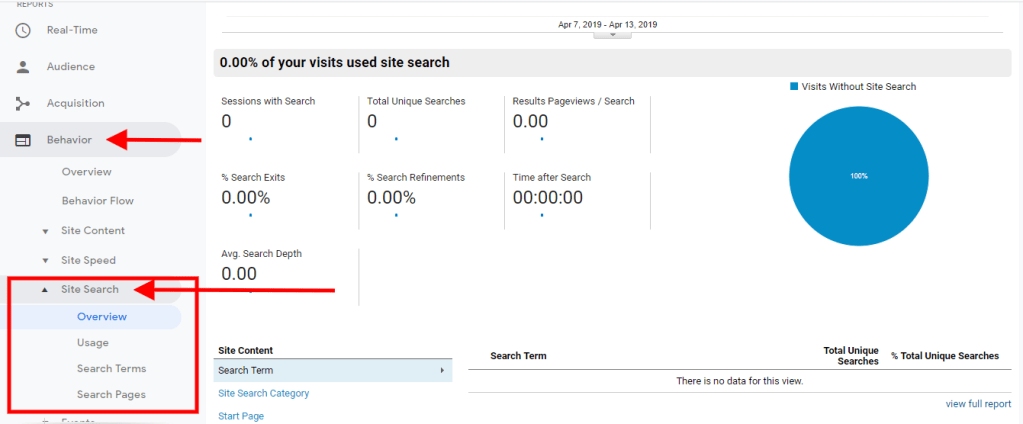 The Google Analytics “Site Search” report gives an overview of the terms, keywords and pages customers are searching for the most on your website.